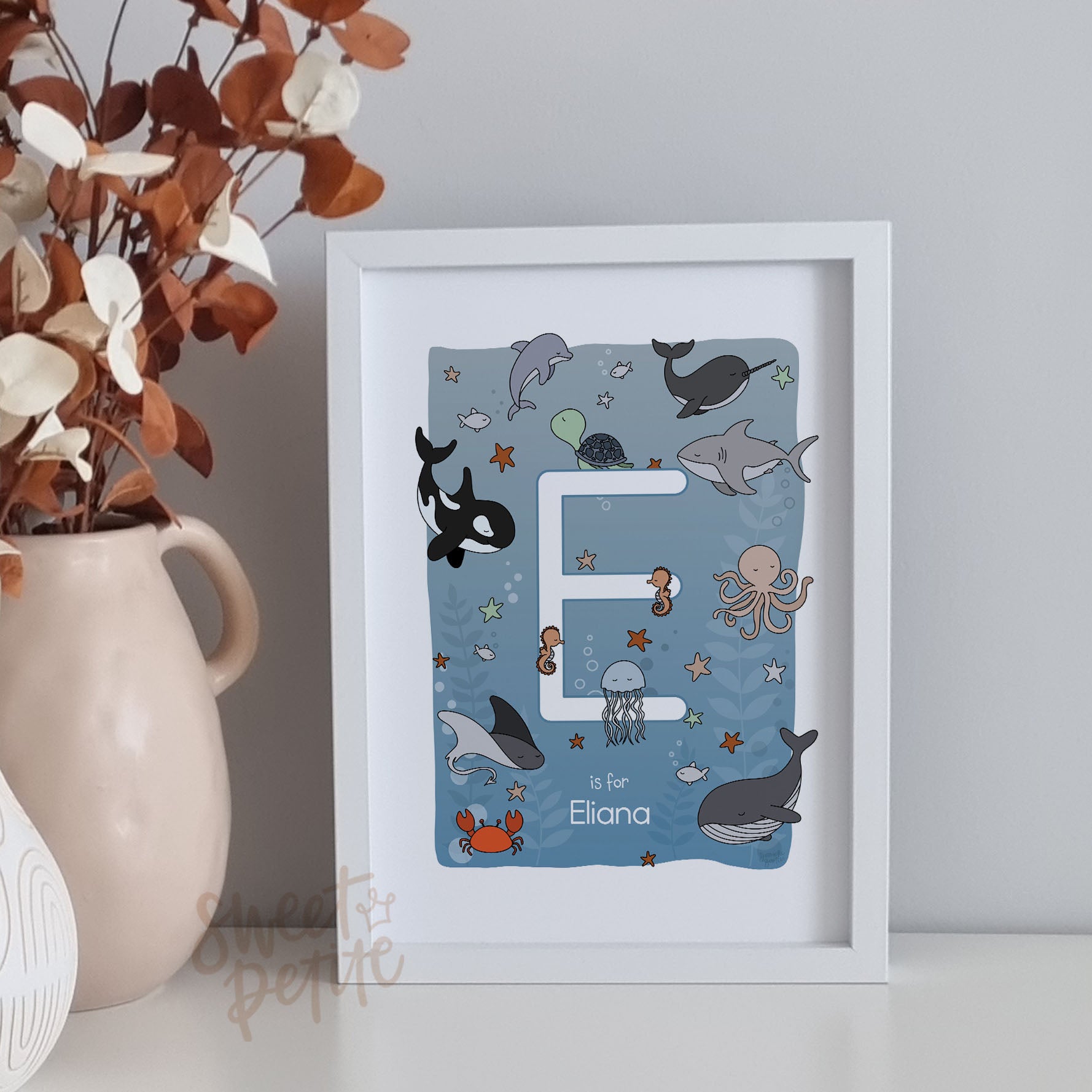 This ocean themed initial print is perfect for lovers of the beach, the ocean and sea creatures. The initial of your child's name is surrounded by a whale, dolphin, octopus, turtle, jellyfish, crab, orca / killer whale, narwhal, shark, stingray, many starfish and even a couple of seahorses!
