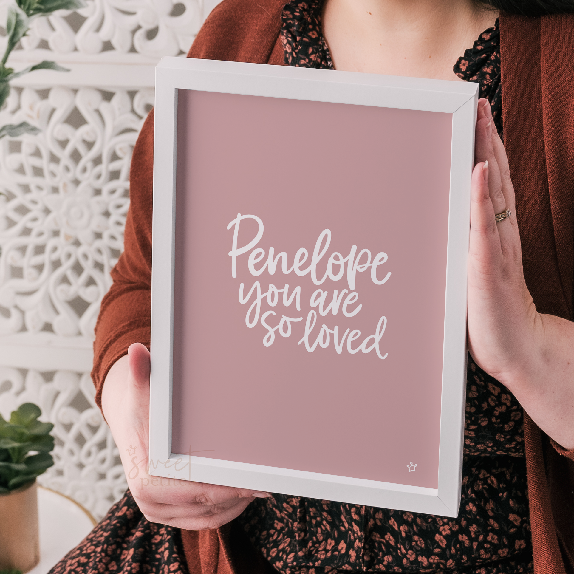 Your chosen child's name will be digitally lettered by hand. The words "You are so loved" are hand written digitally in a bouncy, fun modern cursive. You can choose your own colours to ensure they receive a print that totally reflects their personality too.