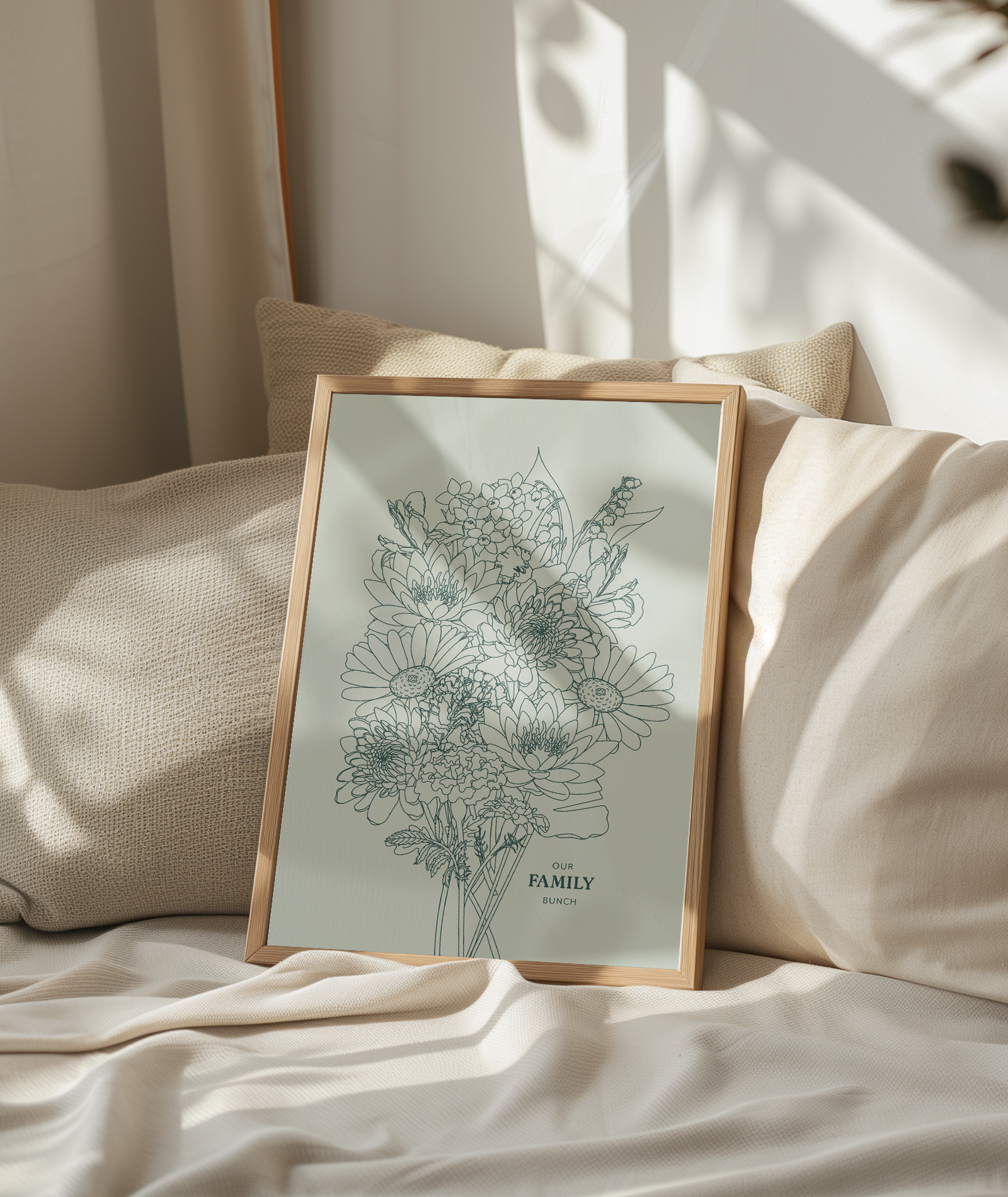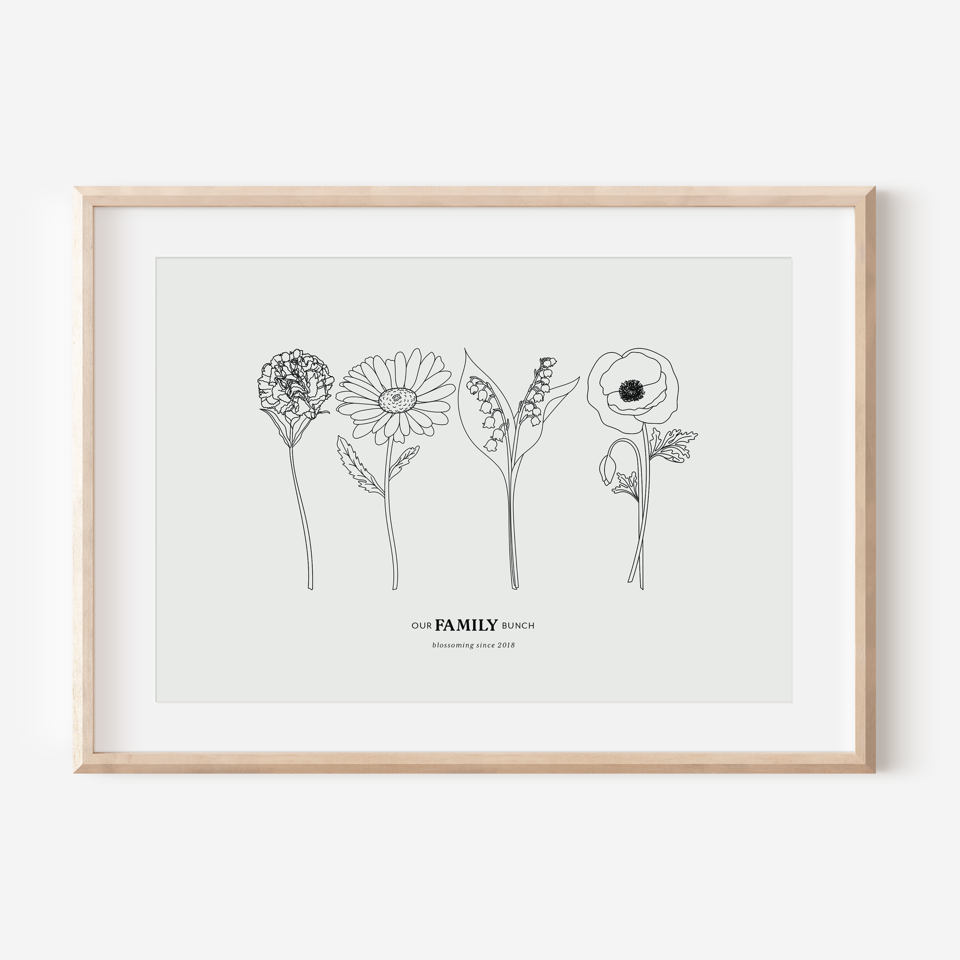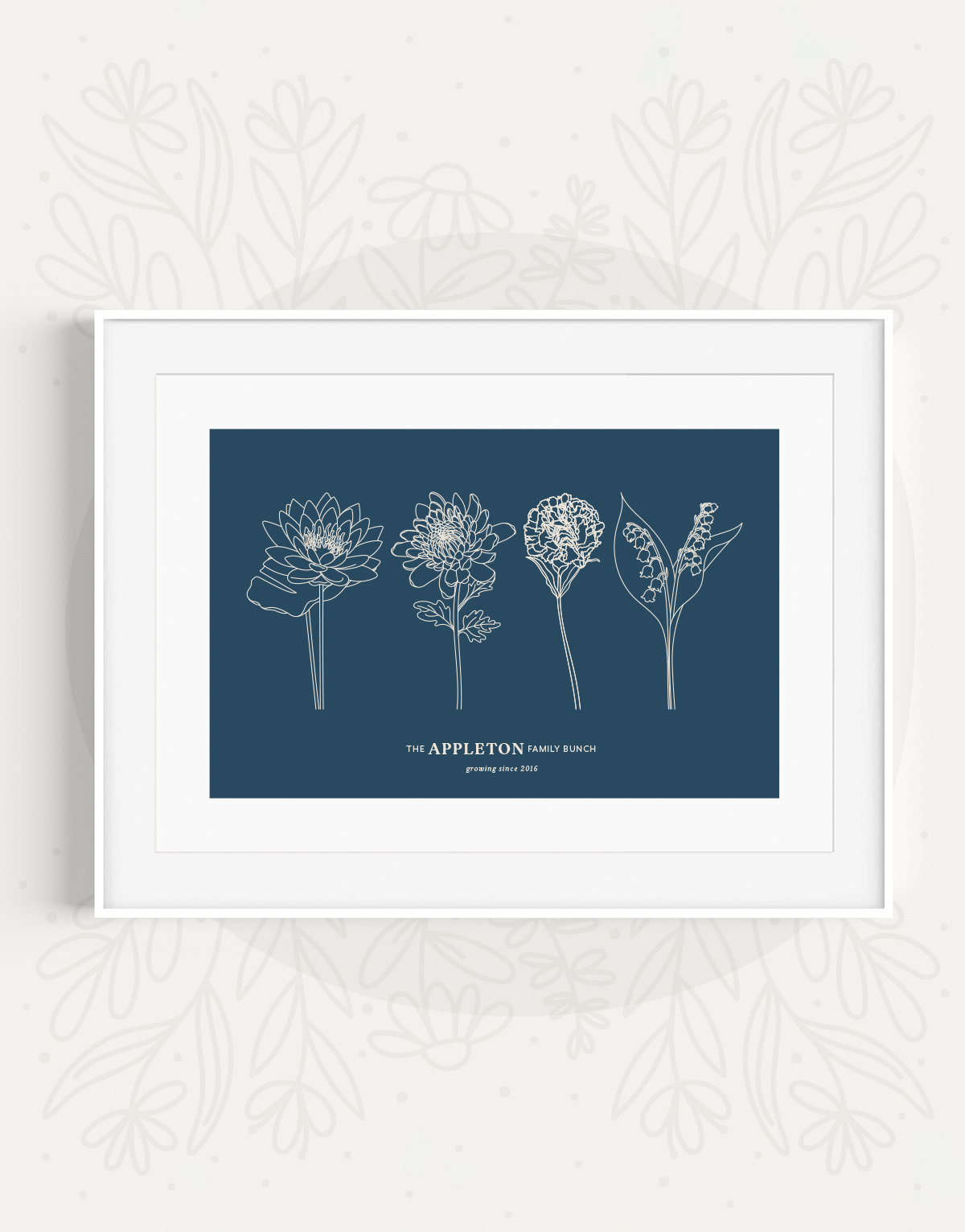 No two prints will be alike, they'll be as unique as your family in terms of the flowers used. Below the floral arrangement are words displaying your family name (example: The Newport Family Bunch and an option to have the line below showing 'growing since 1964.' If you don't want a date included, leave this space blank.