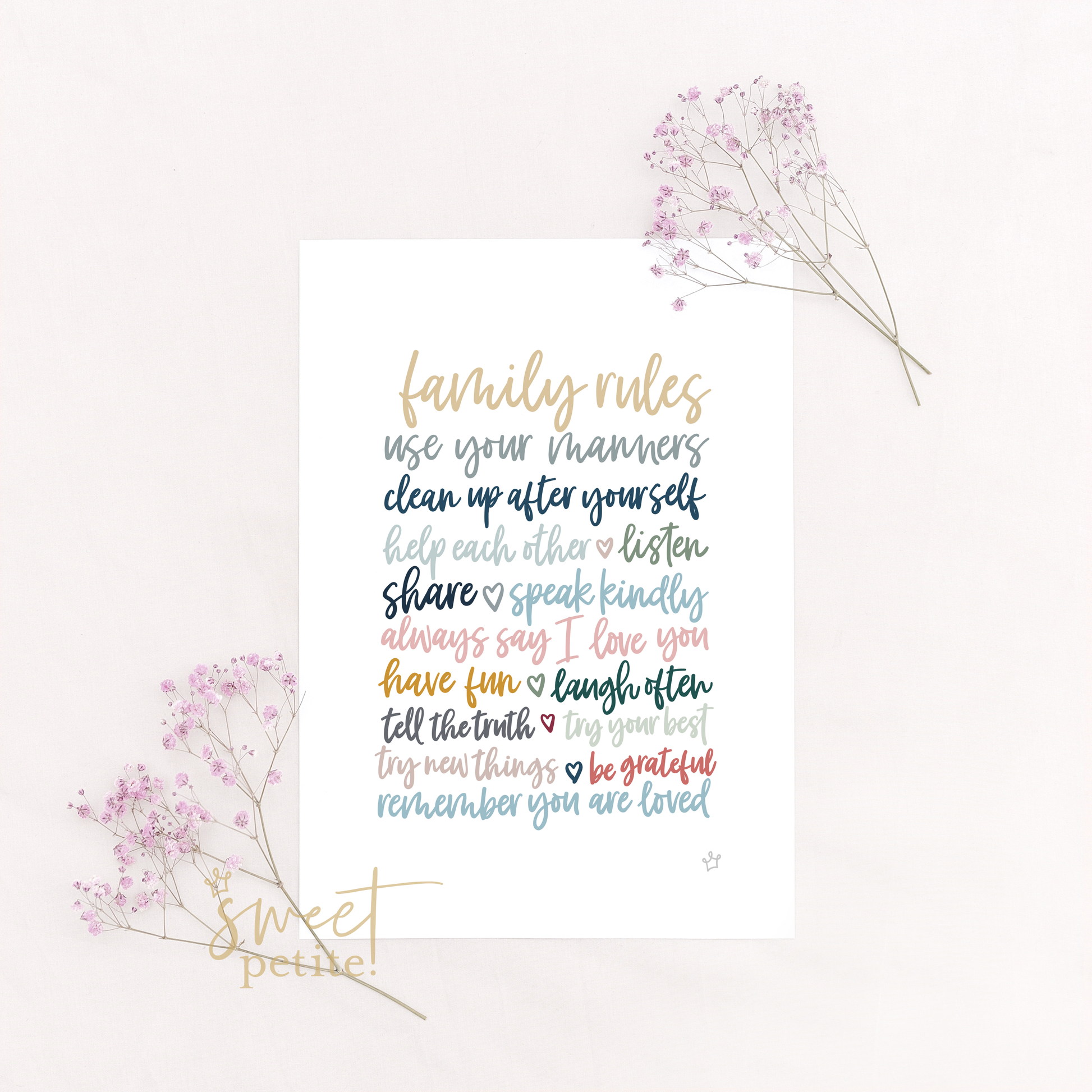 The Family Rules print is a statement piece that gives beautiful cues for your children about the rules in your home. The sayings within this print can be gentle prompts to teach them about treating others with kindness, love and care. The nurturing statements have been chosen carefully and are great ways to remind them how valuable they are within your family and the importance of giving everything a go.