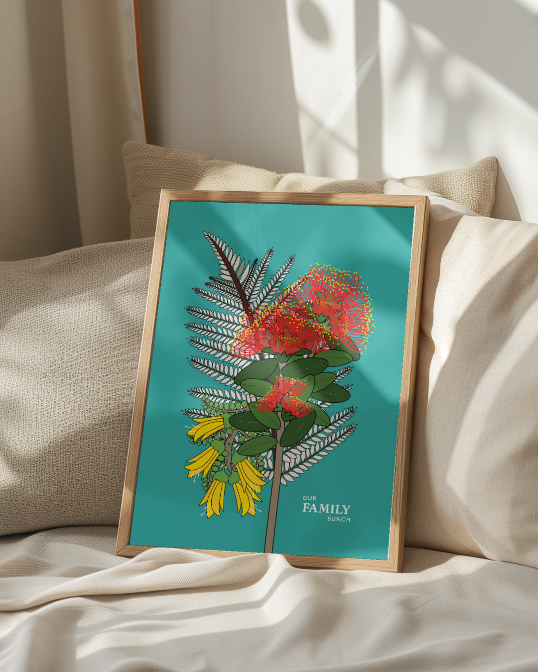 No two prints will be alike, they'll be as unique as your family in terms of the flowers used. Some minor adjustments of the NZ natives may occur to create a cohesive bouquet that represents your family, while showing off the best of each flower (such as extending a stem or adapting an extended leaf to fit within the artwork.)