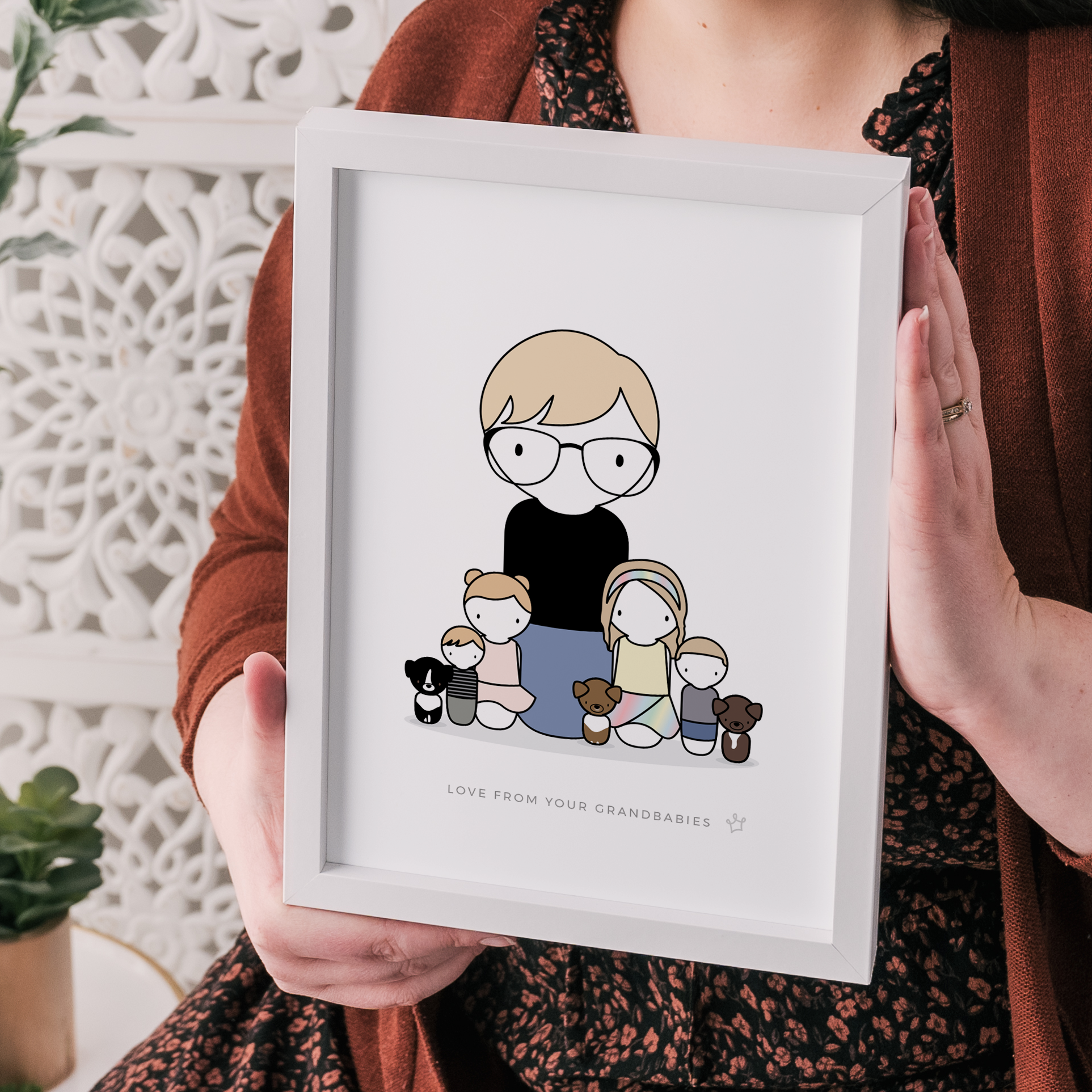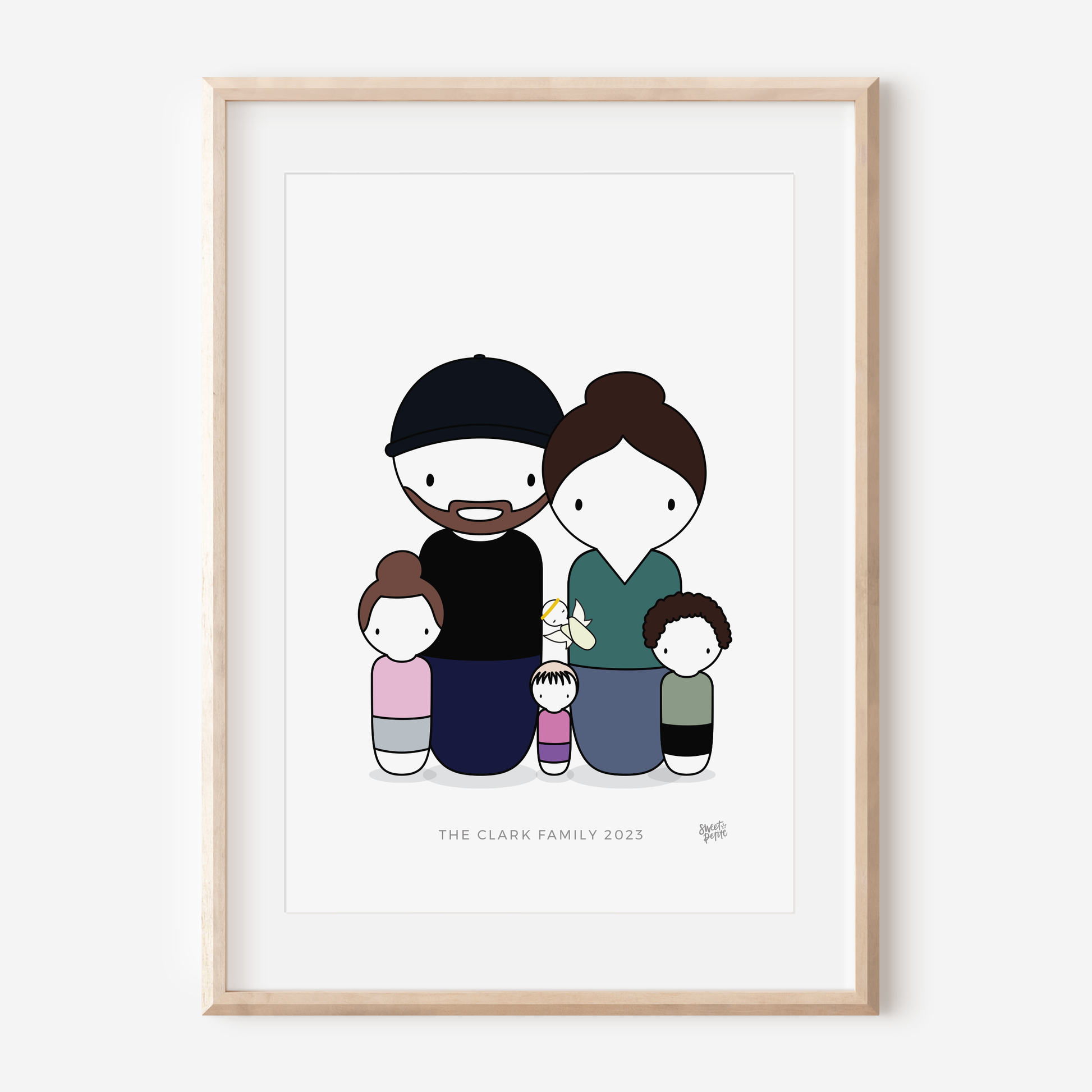 A personalised Peg Family Portrait perfectly represents those you love - both near and far. With each family member individually designed to match their unique style, you're capturing a beautiful moment in time. The kids are clean; nobody is grumpy that they're cold out at the park, and the best bit is that you haven't even had to leave the house! I love to include pets of all kinds - they're family too! One of the great bonuses to having a family portrait created like this is that you don't all have to be in the same place together!