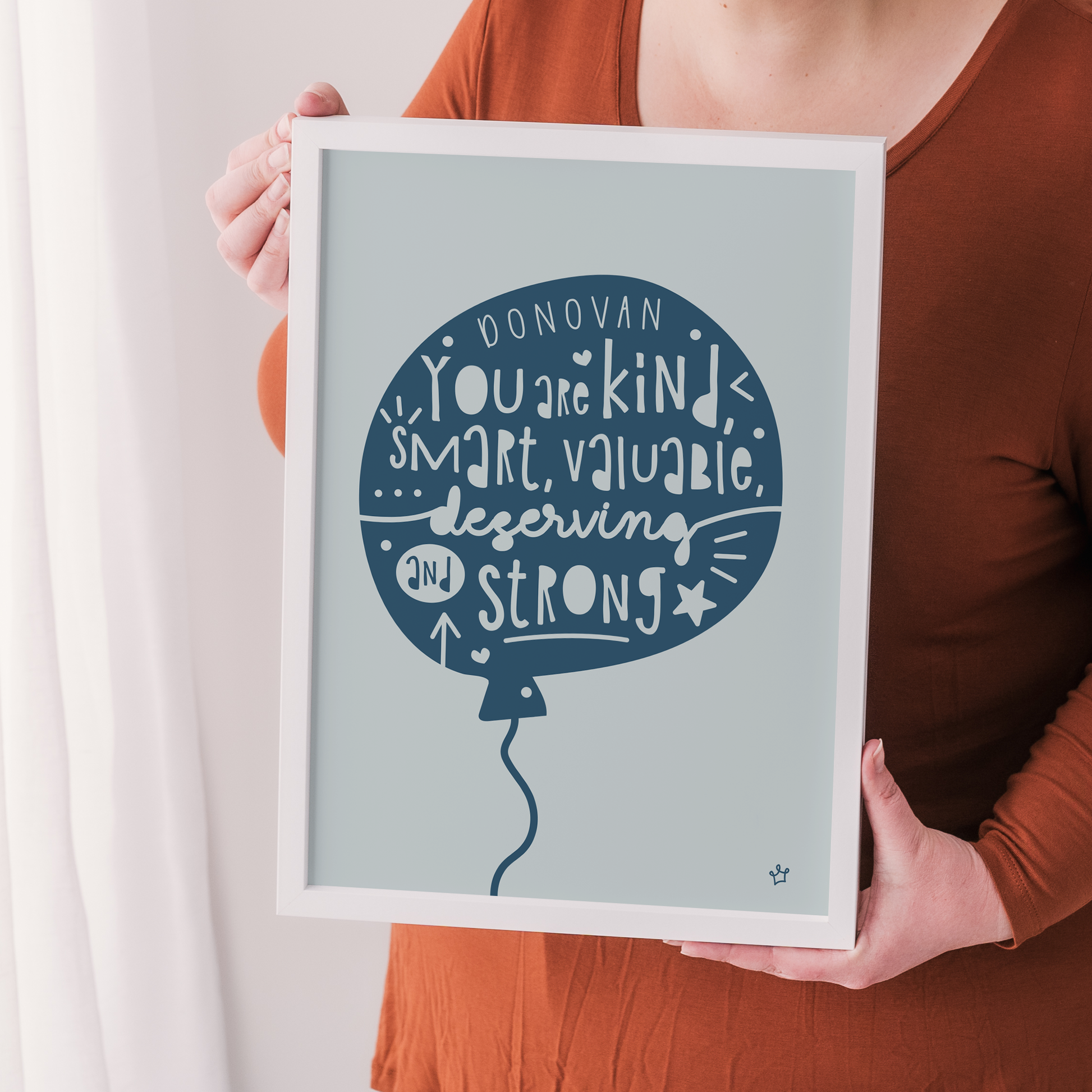 Your chosen child's name will appear in a custom, hand lettered font that I've designed. Two funky fonts depict the words "You are kind, smart, valuable, deserving and strong" upon a star balloon shape. The remaining balloon is filled with doodles and shapes that pair well and ensure that this lively print is engaging for the viewer.